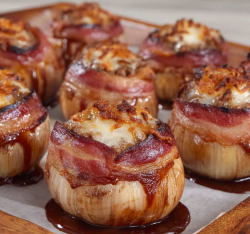 These Bacon Cheddar Onion Bombs are the ultimate game-day appetizer or indulgent dinner—juicy beef stuffed with melty cheddar, wrapped in sweet onions, and cloaked in crispy bacon, all glazed with sticky BBQ sauce. One bite and they’ll detonate with deliciousness!