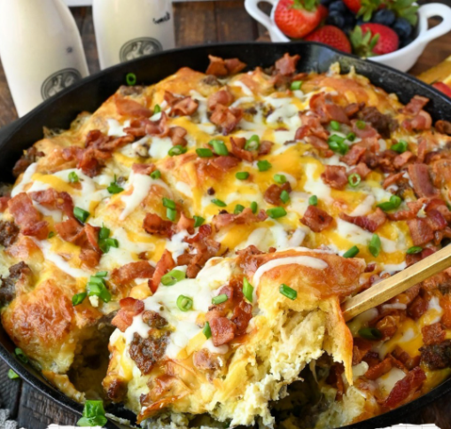 This easy, hearty breakfast bake layers fluffy biscuit pieces, crispy bacon, savory sausage, and cheesy eggs—perfect for feeding a crowd or meal prepping!