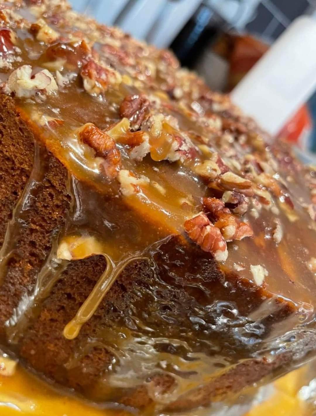 This decadent cake is a fall flavor explosion—tender, spiced, and dripping with caramel-pecan goodness! 😍