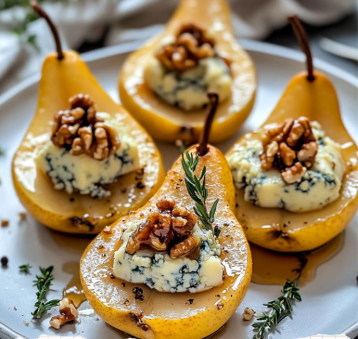 Ripe pears transform into edible vessels for a luxurious filling of tangy blue cheese, crunchy walnuts, and golden honey – baked until warm and caramelized for a stunning starter or dessert.