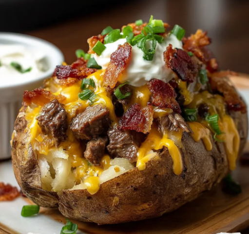 Imagine crispy-skinned baked potatoes stuffed with juicy Cajun-spiced steak bites, drowned in a velvety parmesan cream sauce – the ultimate comfort food upgrade!