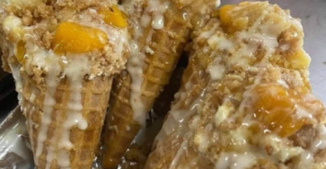 A Genius Dessert Mashup with Buttery Crumb Topping & Creamy Cheesecake Frosting Imagine warm peach cobbler meets ice cream cone…