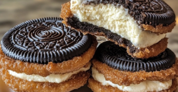 Crispy, golden Oreo sandwiches stuffed with creamy cheesecake filling, deep-fried to perfection, and dusted with powdered sugar—the ultimate fairground treat…