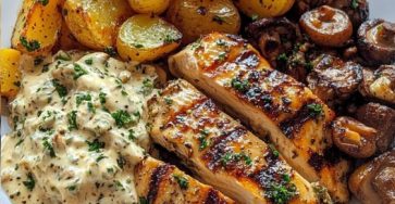 A luxurious Mediterranean-tropical fusion dish featuring garlic-coconut marinated chicken, crispy rosemary potatoes, and a velvety mushroom basil pesto cream sauce.…