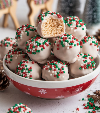 The Festive White Chocolate & Crisp Rice Treat Ball is proof that the most memorable holiday creations are often the simplest. It captures the essence of the season: a little bit of crunch, a lot of sweetness, and a whole lot of sparkle, all wrapped up in a bite-sized package of joy. By bypassing the oven and embracing the stovetop, this recipe invites everyone into the kitchen to participate in the fun. Whether you’re crafting them for a gathering, packing them as gifts, or simply keeping a secret stash in the fridge, these delightful balls are sure to become a cherished part of your holiday baking tradition. So gather your ingredients, embrace the sprinkle-induced glitter, and create a batch of these easy, enchanting treats that celebrate the simple, sweet magic of the holidays.