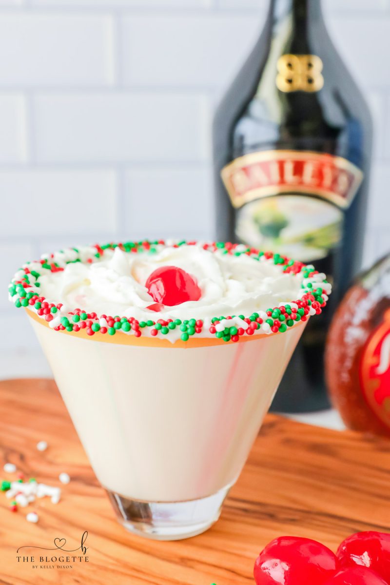 - Prepare the Glass: Take a chilled martini glass. Using a knife or small spatula, spread a thin layer of vanilla frosting onto a small plate. Dip the outer rim of the glass into the frosting to coat it evenly. On a separate plate, spread out your holiday sprinkles or sanding sugar. Gently dip and roll the frosted rim in the sprinkles until fully coated. Set the prepared glass aside.
